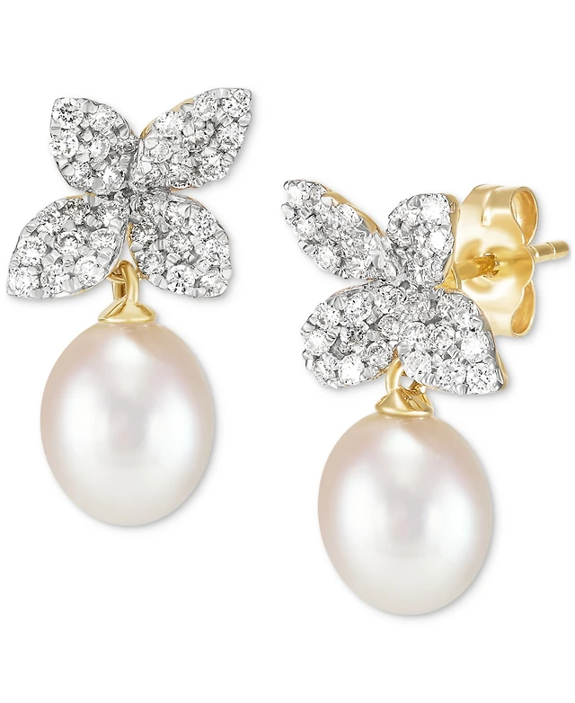 Honora Cultured Freshwater Pearl (6-6-1/2mm) & Diamond (1/6 ct. t.w.) Bow Earrings in 14k Yellow Gold