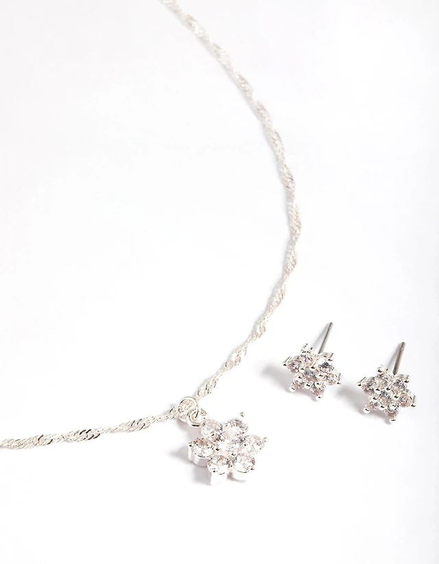 Silver Cubic Zirconia Twist Round Diamante Earrings & Necklace Set