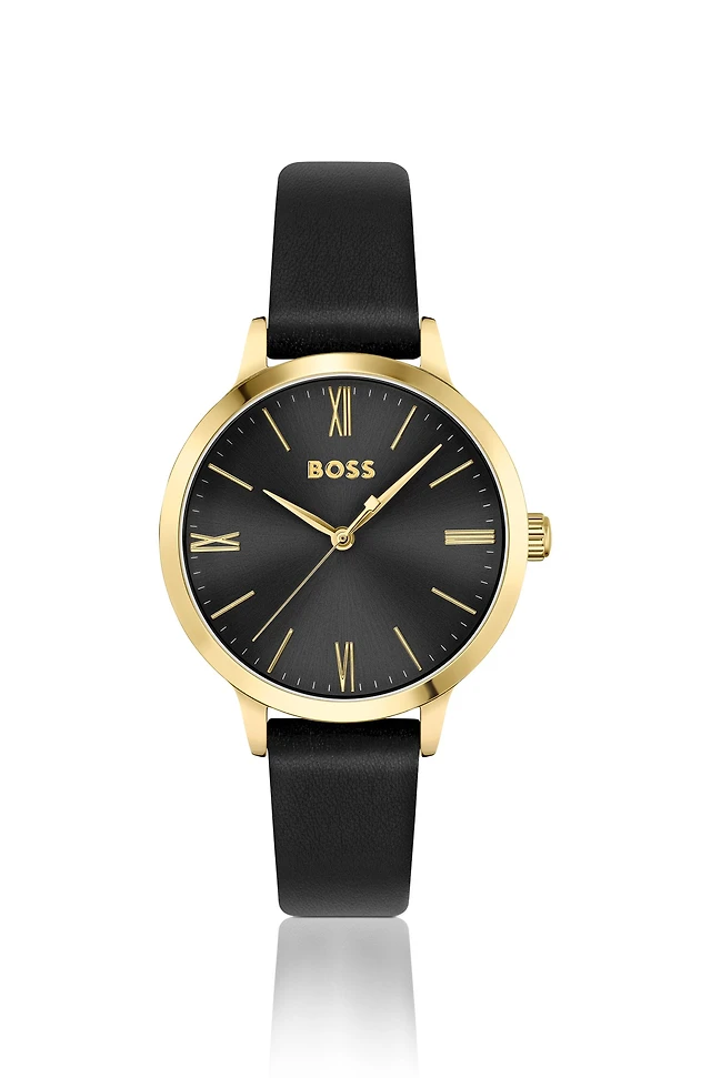 Leather-strap watch with brushed black dial