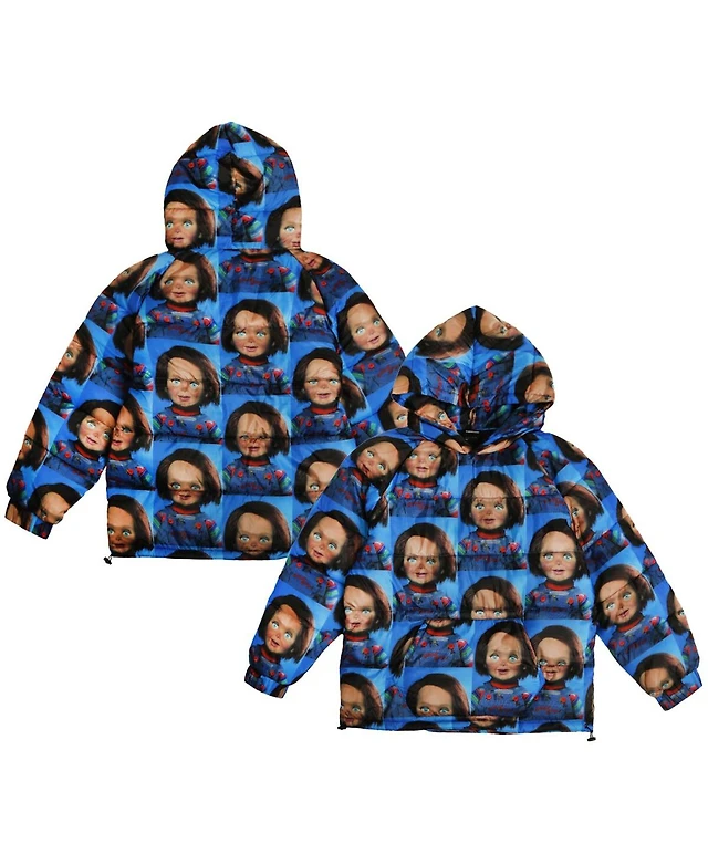 Dumbgood Men's Blue Chucky Repeat Puffer Hoodie Full-Zip Jacket