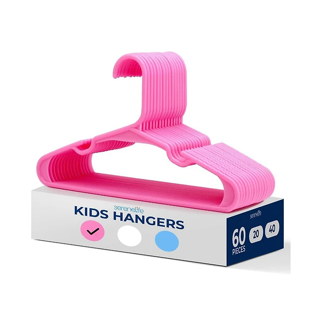 SereneLife 60 Pcs. Non-Slip Plastic Kids Hangers - Durable and Space-Saving Closet Organizers for Infants, Toddlers, and Kids' Clothing (Pink
