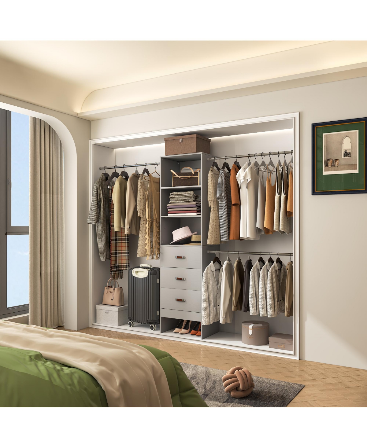 Aheaplus 10FT Closet System with 3 Drawers, 120'' Walk-in Organizer Shelving Towers and Hanging Rods