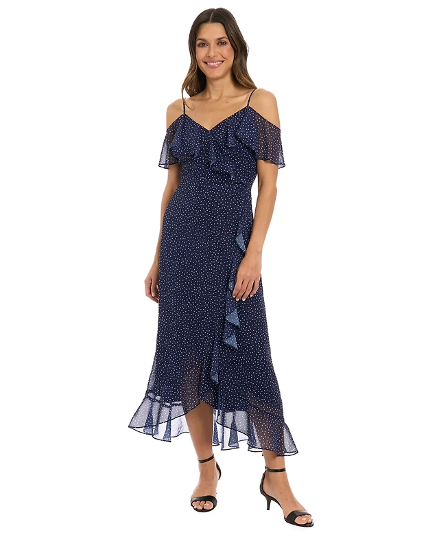 24seven Comfort Apparel Ruffle Cold Shoulder A Line Maxi Dress
