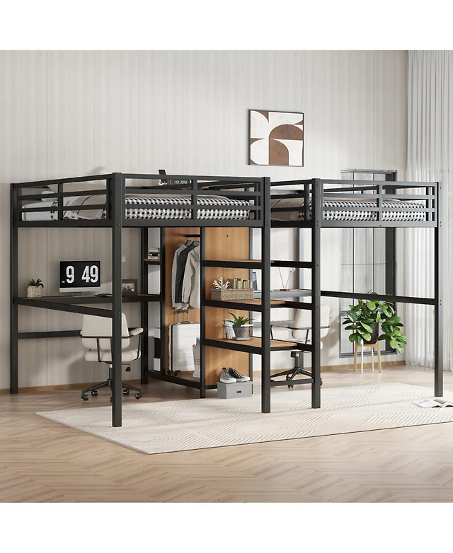 Streamdale Furniture Twin Metal Loft Bed with Desk Wardrobe & Shelves - Woodgrain