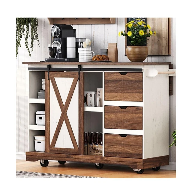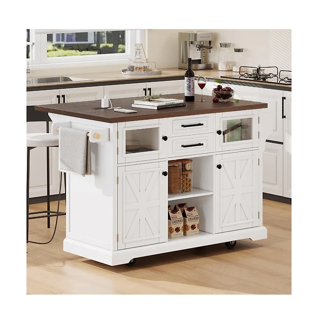 Maison Boucle 55.5" Farmhouse Kitchen Island with Drop Leaf, Barn Door, Power Outlet & Storage Drawers, Rolling Cart on Wheels-Maison Boucle