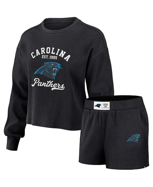 Women's Wear by Erin Andrews Black Distressed Carolina Panthers Waffle Knit Long Sleeve T-shirt and Shorts Lounge Set