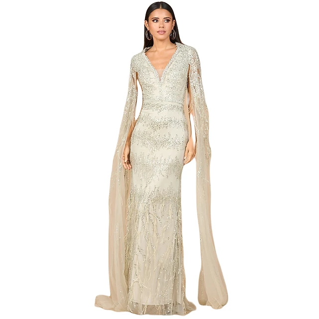 Lara Women's V - Neck Gown with Long Cape Sleeves