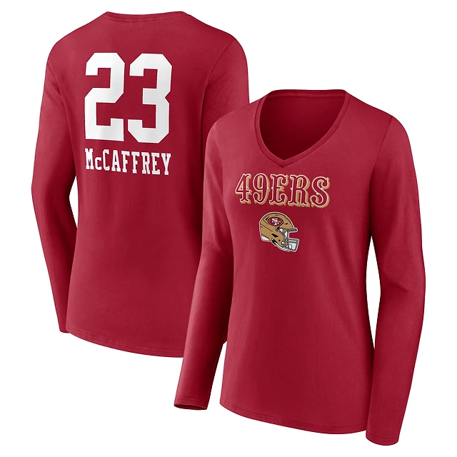 Women's Christian McCaffrey Scarlet San Francisco 49ers Team Wordmark Player Name & Number Long Sleeve V-Neck T-Shirt