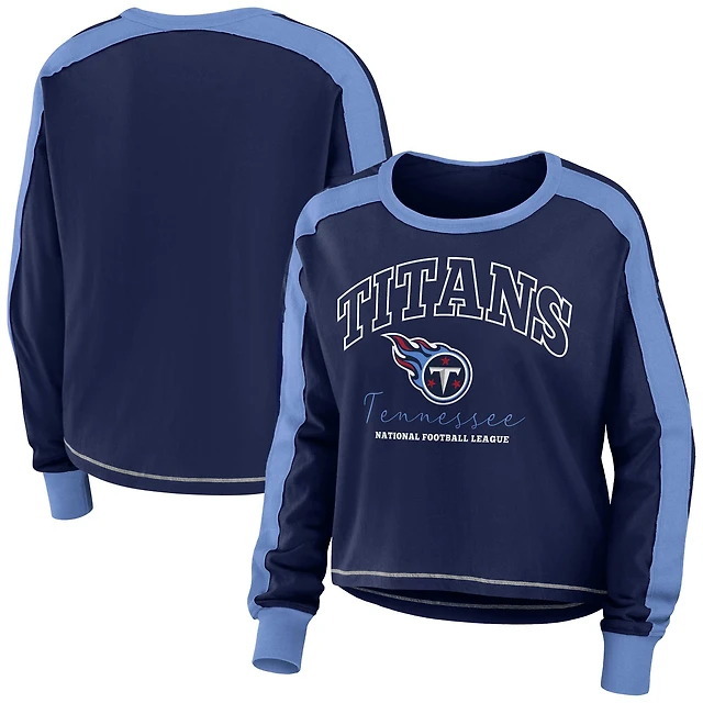 Women's WEAR by Erin Andrews Navy/Light Blue Tennessee Titans Color Block Modest Crop Long Sleeve T-Shirt