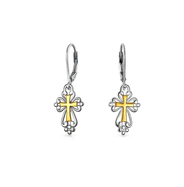 Bling Jewelry Filigree Two Tone Fleur De Lis Cross Dangle Earrings Gold Plated Silver