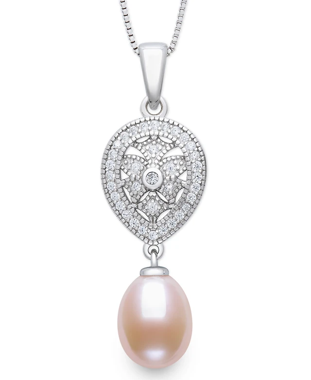 Belle de Mer Cultured Freshwater Blush Pink Drop Pearl (8-9mm) and Lab Created Sapphire Necklace in Sterling Silver