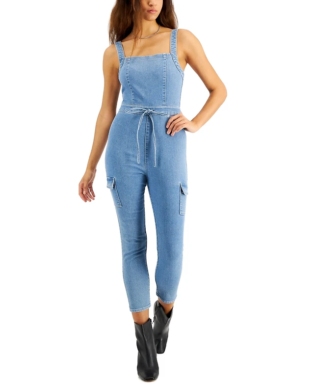 Tinseltown Juniors' Belted Denim Jumpsuit with Ruffle