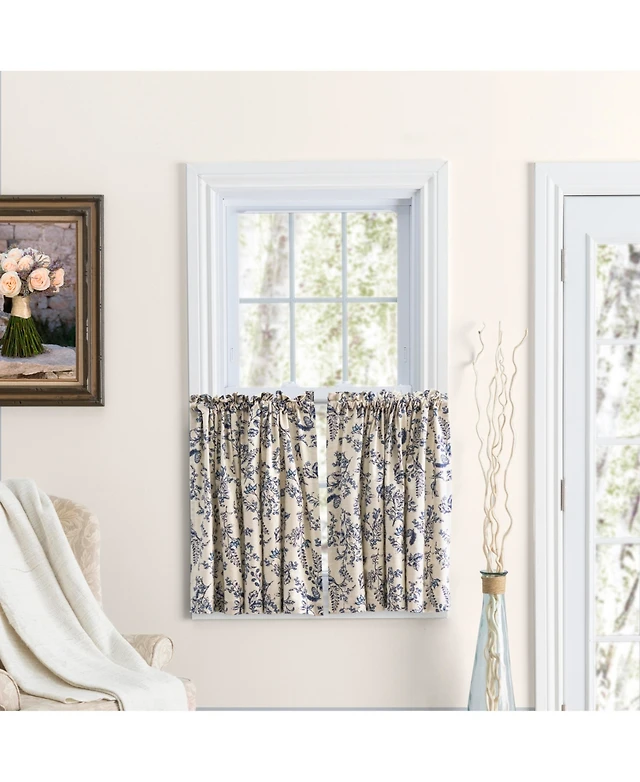 Ellis Curtain Madison Floral Design Printed Natural Ground 1.5" Rod Pocket Tailored Tier 56" x 36" Blue