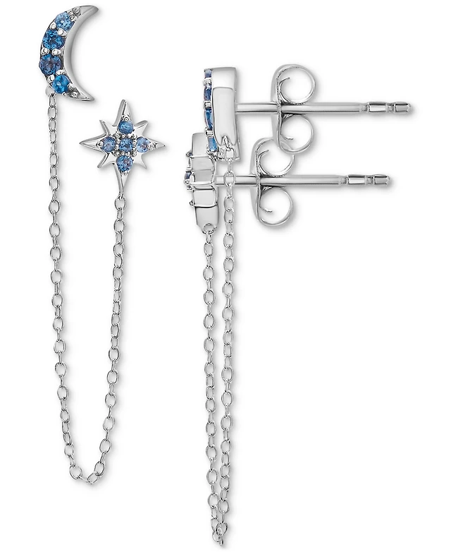 London Blue Topaz (1/2 ct. t.w.) Moon & Star Double Pierced Chain Drop Earrings in Sterling Silver