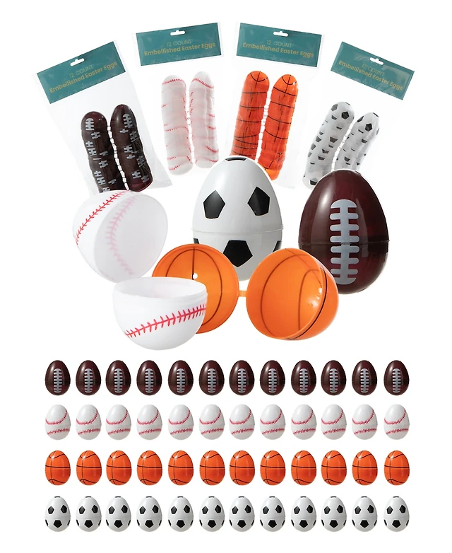 Glitzhome 48 Pack 2.25" H Easter Plastic Fillable Sports Eggs, 12 of Each Basketball, Football, Baseball, Soccer