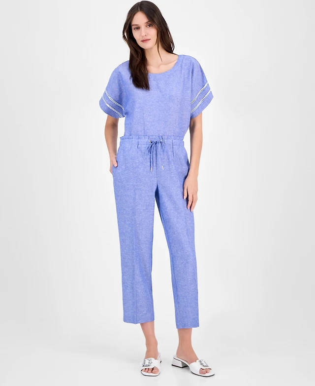 Drawstring Waist Linen-Cotton Straight-Leg Jeans