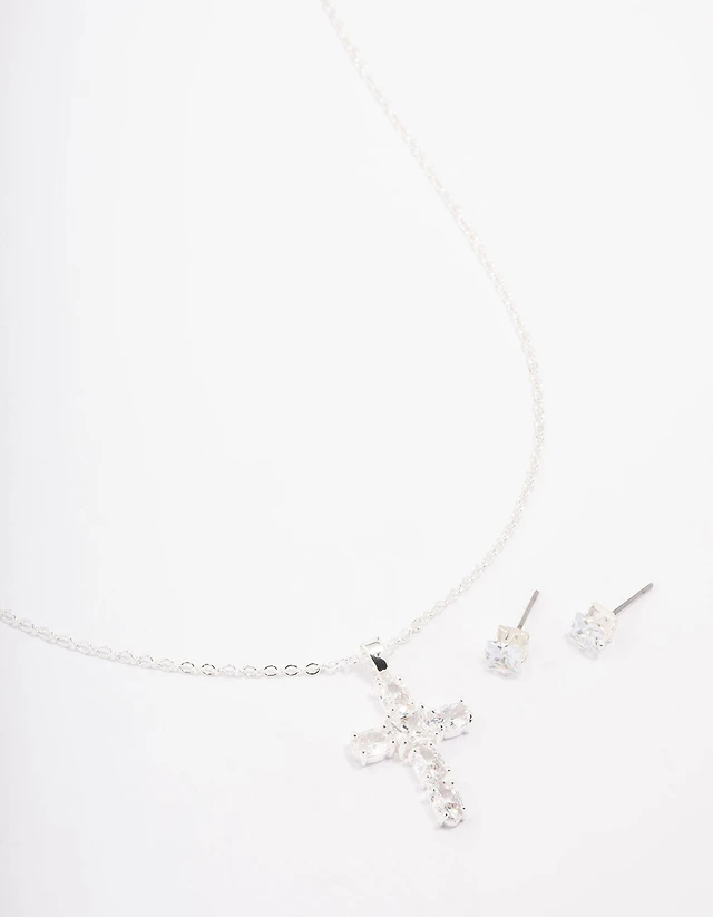 Silver Plated Cubic Zirconia Square Cross Pendant Necklace & Stud Earring Set
