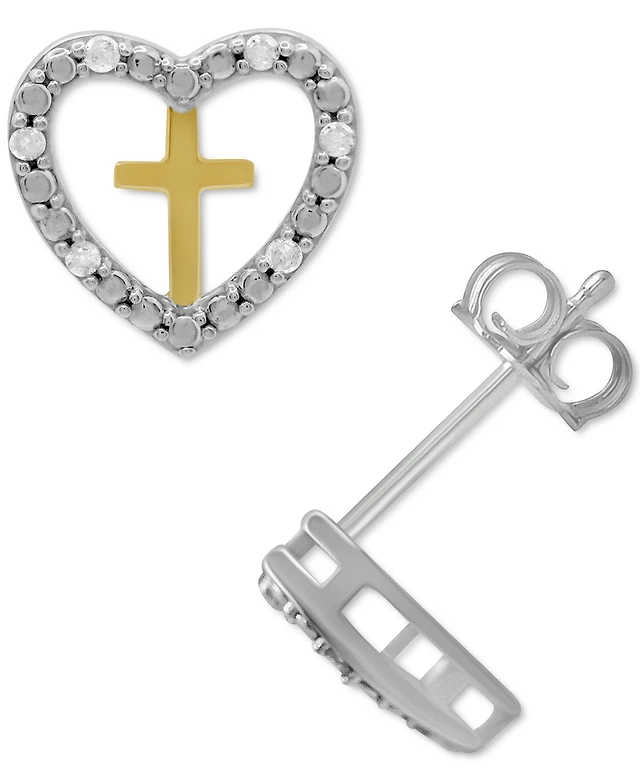 Diamond Heart & Cross Stud Earrings (1/10 ct. t.w.) in Sterling Silver & 14k Gold-Plate