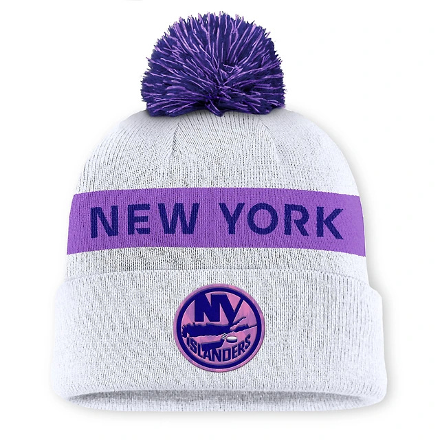 Men's Fanatics White New York Islanders Hockey Fights Cancer Cuffed Knit Hat with Pom