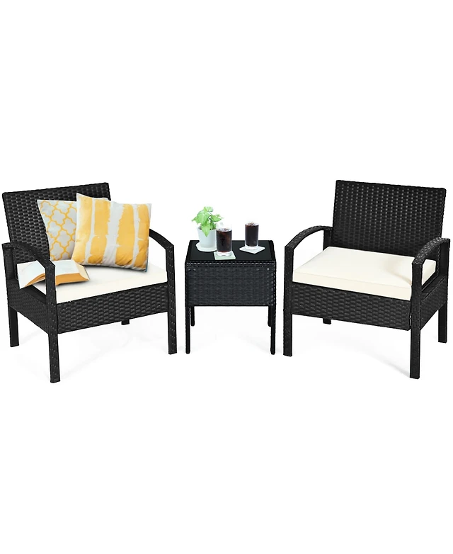 Gymax 3 Pcs Patio Wicker Rattan Furniture Set Coffee Table & 2 Rattan Chair W/Cushion