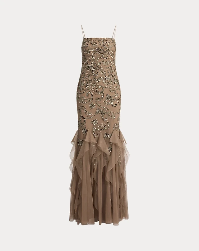 Ruffle-Trim Paisley-Beaded Tulle Gown