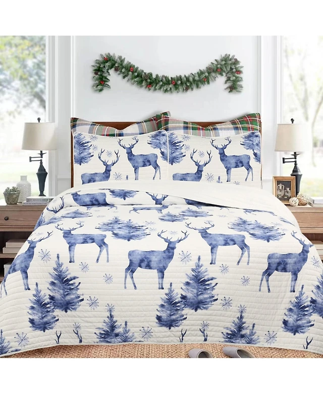 gaomon Christmas Quilt Set Queen, 3-Piece Reversible Boho Bedspread with Christmas Tree, Reindeer & Snowflake Pattern, Lightweight All-Season Bedding