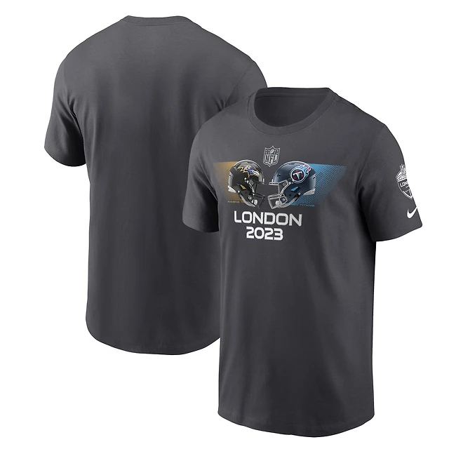 Men's Nike Anthracite Baltimore Ravens vs. Tennessee Titans 2023 London Game Essential T-Shirt