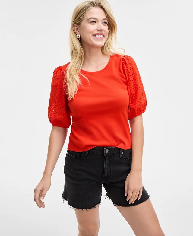 Women's Short Eyelet-Cut-out Sleeve Scoop Neck Top
