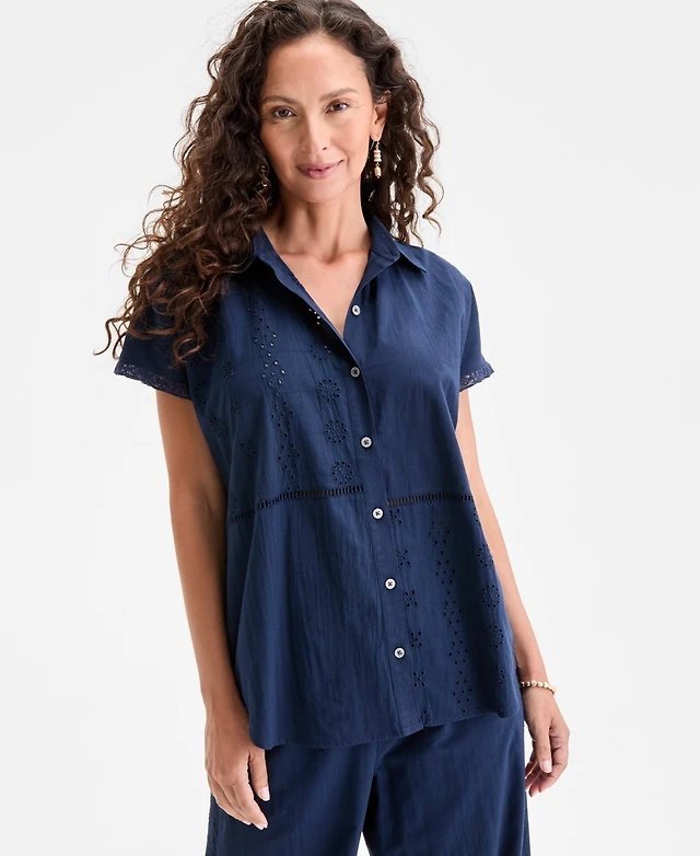 Style & Co Petite Eyelet-Detail Cotton Camp Shirt, Exclusively at Macy's