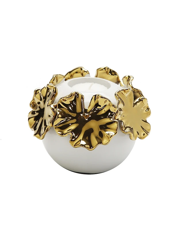 White Ceramic Candle Holder Gold-Tone Flower Design