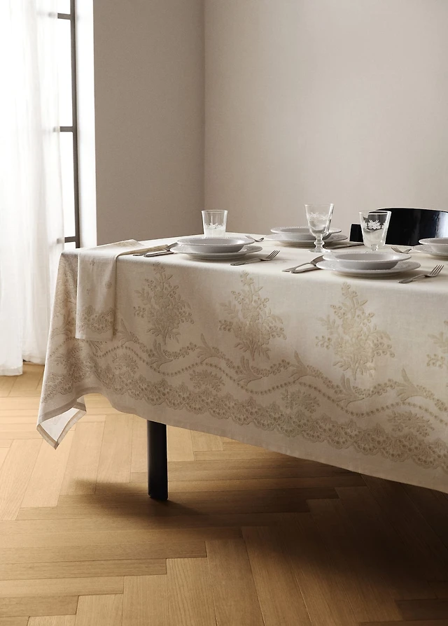 Cotton linen tablecloth with floral design for 6 to 8 diners