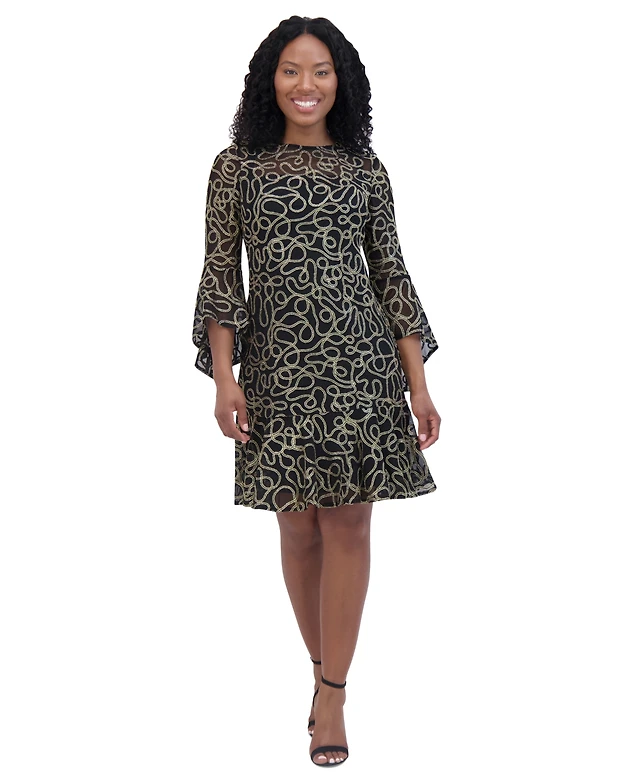 London Times Plus Floral Long-Sleeve Flounce-Hem Midi Dress