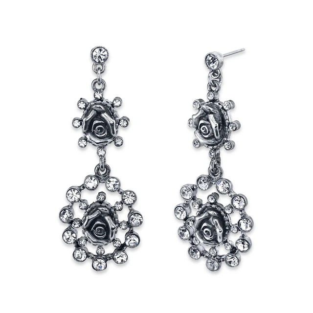 White Gold Plated with Cubic Zirconia Double Flower Cluster Dangle Earrings