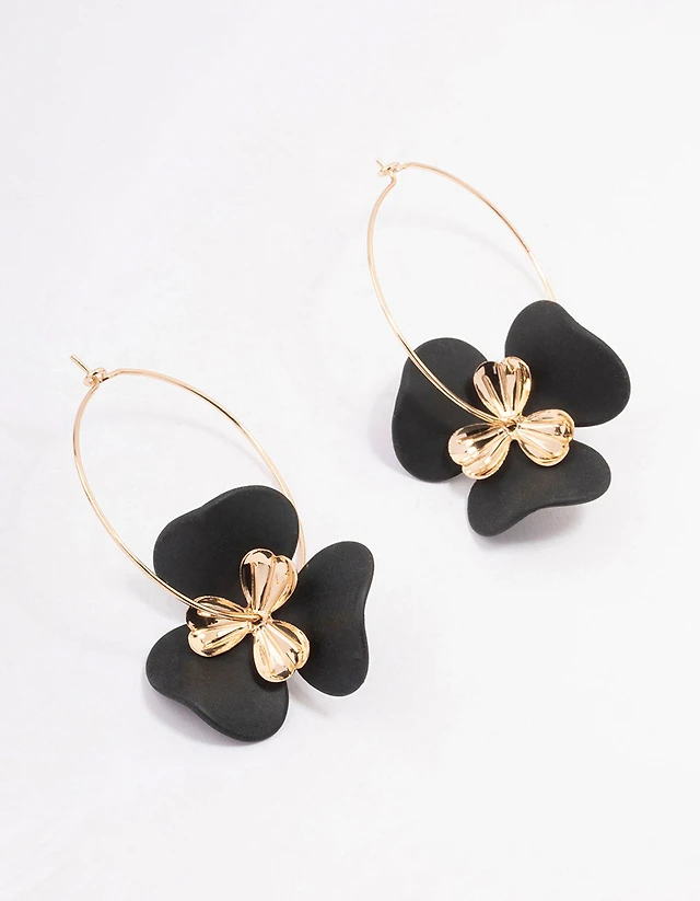 Gold & Black Coated Textured Pearl Flower Hoop Earrings