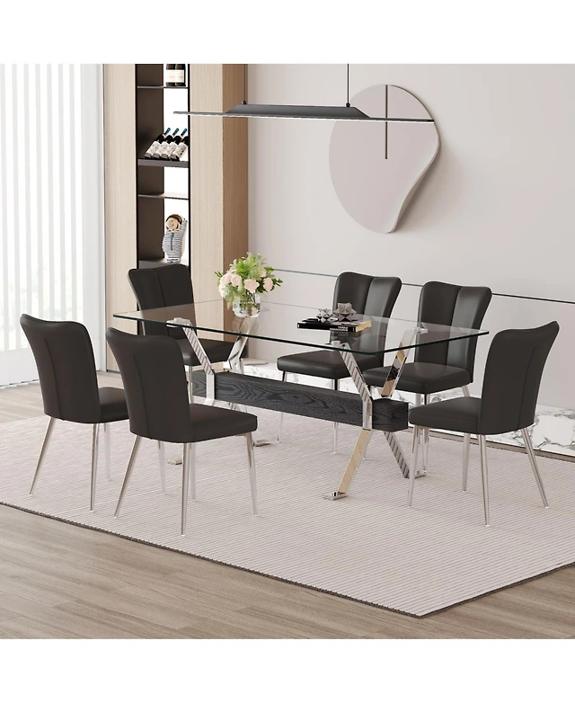 Streamdale Elegant Glass Dining Set with 6 Black Striped Pu Chairs (71"x35.4")