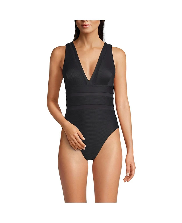 Lands' End Women's Mesh Ribbed Plunge High Leg One Piece Swimsuit