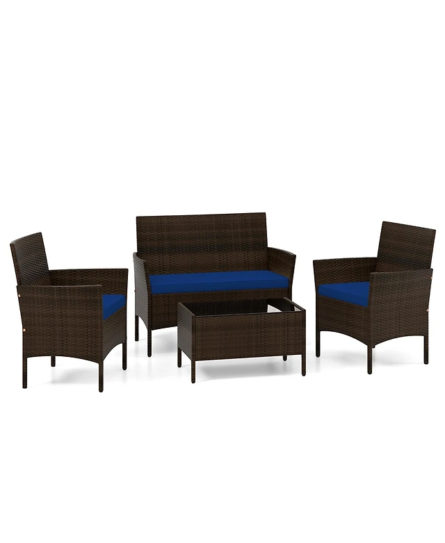 Gymax 4PCS Rattan Outdoor Conversation Set Patio Furniture Set w/ Navy Cushions