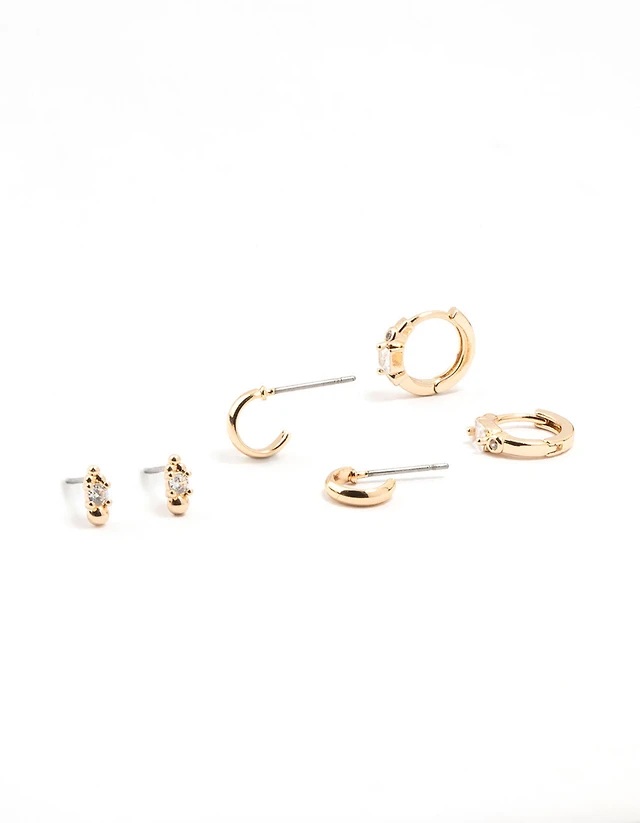 Gold Cubic Zirconia Heart & Twisted Huggie Earrings 3-Pack