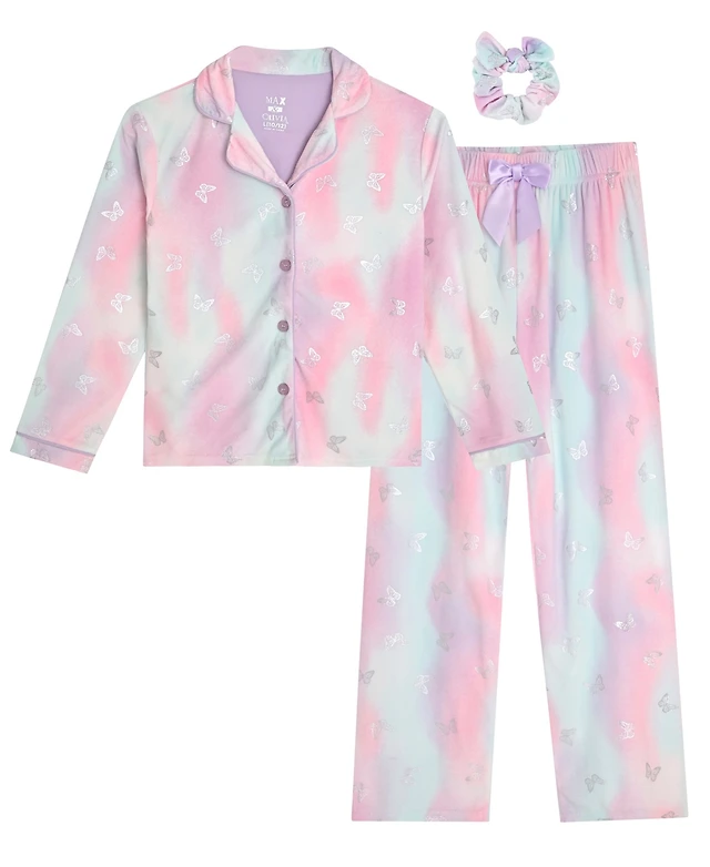 Max & Olivia Little and Big Girls 3-Piece Plaid Coat, Pants Scrunchie Pajama Set
