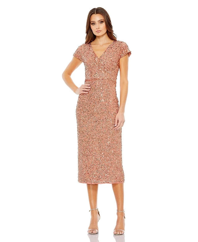 Mac Duggal Women's Sequined Short Sleeve Wrap Over Cocktail Dress