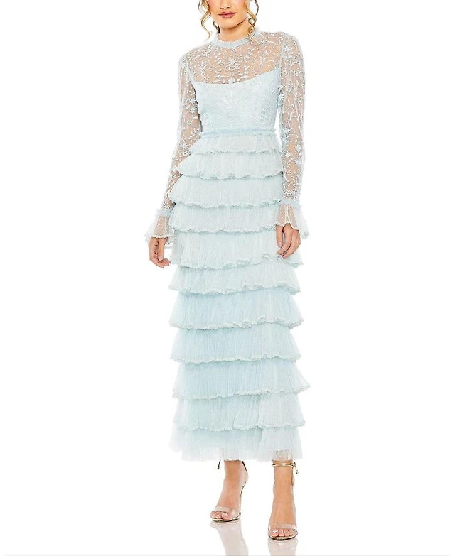 Mac Duggal Women's Applique High Neck Puff Sleeve A Line Dress