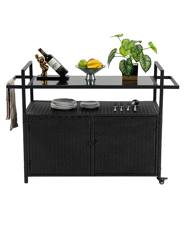 Gouun Outdoor Bar Cart Rolling Wicker Buffet Serving Cart with Tempered Glass Top Storage Cabinet and 8 Hooks