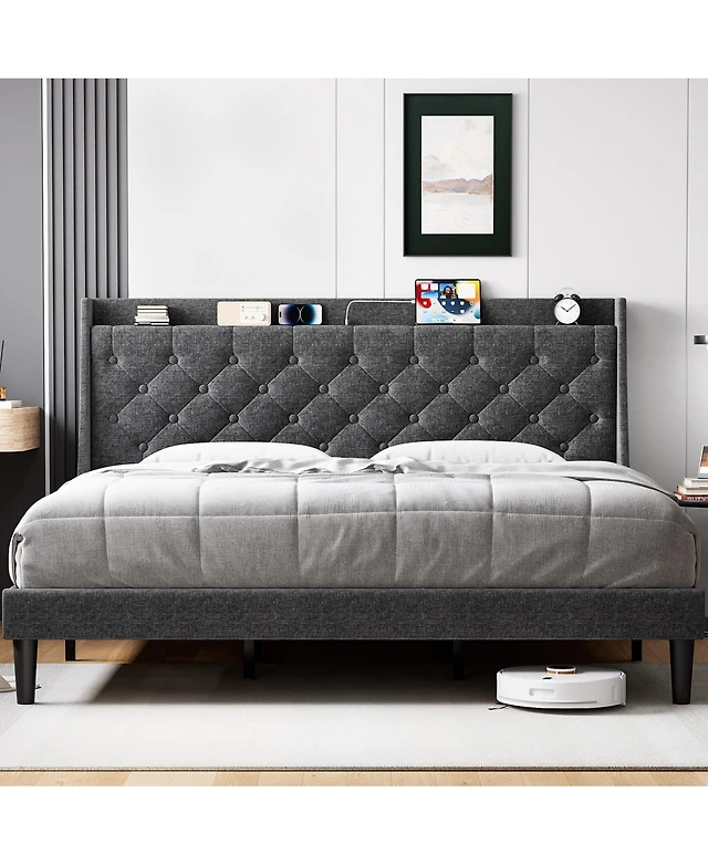 Linen Upholstered Platform Bed with Button-Tufted Headboard – Modern Bed Frame with Wood Slats, No Box Spring Needed