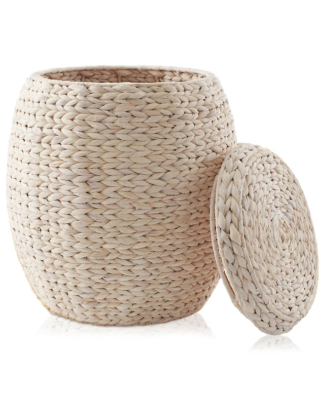 Casafield Round Storage Basket with Lid, Whitewash - Handwoven Water Hyacinth Hamper Organizer for Laundry, Blankets, Plants