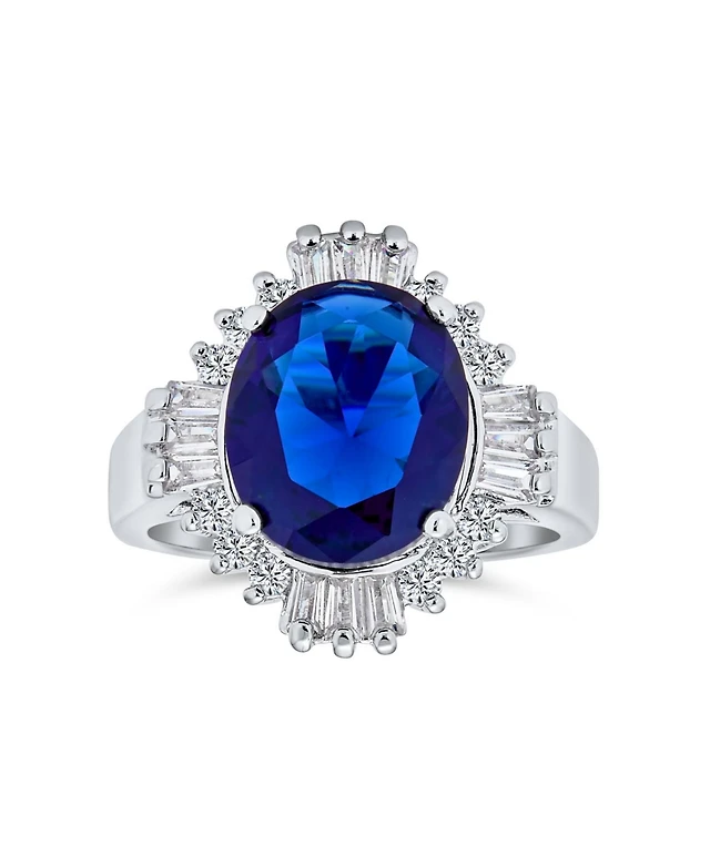 Bling Jewelry Art Deco Style Royal Blue Oval Baguette Halo 6CT Cz Solitaire Statement Promise Ring Silver Plated