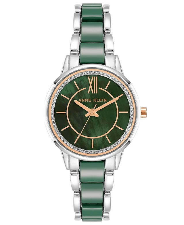Anne Klein Women's Three-Hand Quartz Silver-Tone Alloy with Green Ceramic Bracelet Watch, 32mm