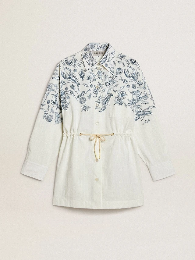 Women's short shirt dress light blue cotton poplin with all-over marine print