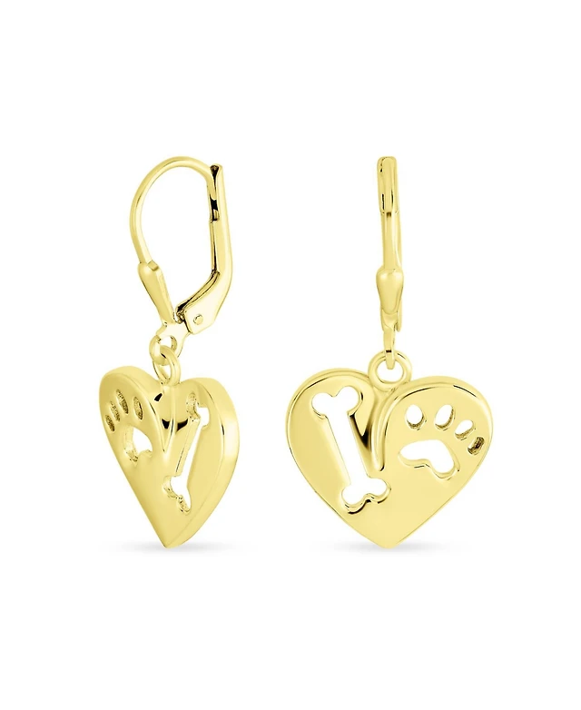Bling Jewelry I Love My Dog Heart Shape Cut Out Puppy Pet Bone Animal Lover Paw Print Drop Dangle Lever back Earrings Gold Plated Sterling Silver