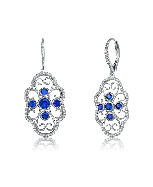 Genevive Sterling Silver White Gold Plated and Blue Cubic Zirconia Leverback Earrings