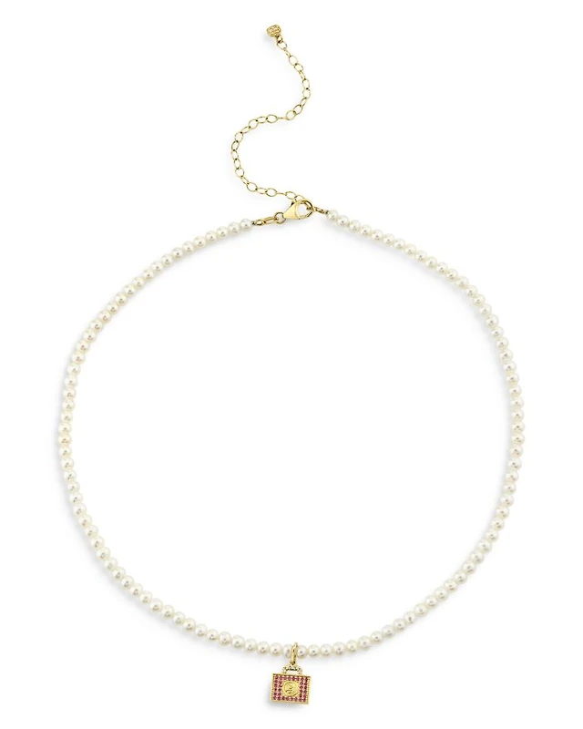 Wicked x Sydney Evan 14K Yellow Gold Pink Sapphire Luggage Charm Freshwater Pearl Necklace, 16"